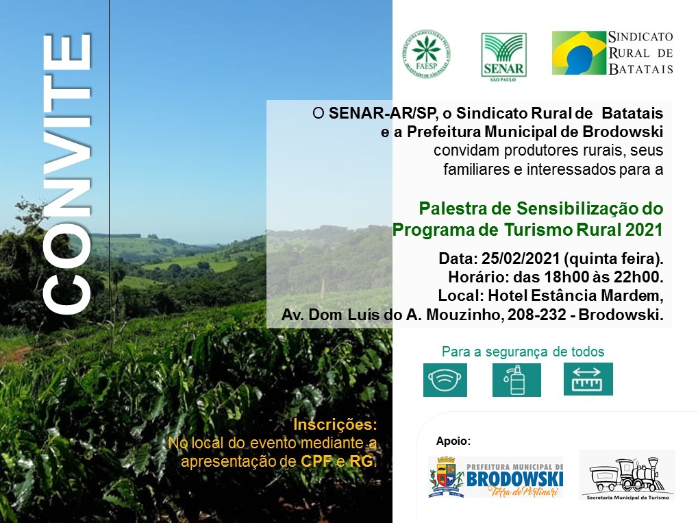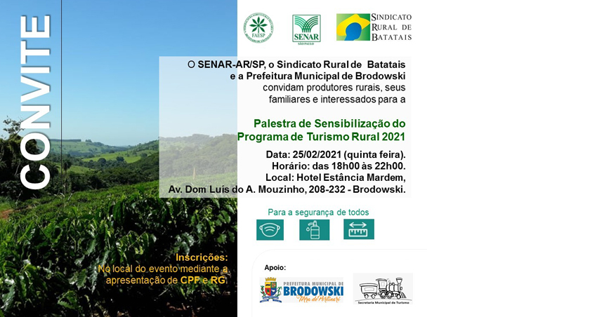 A Prefeitura do Município de Interesse Turístico de Brodowski, através da Secretaria Municipal de Turismo de Brodowski, convidam para palestra de Sensibilização do Programa de Turismo Rural/ 2021.