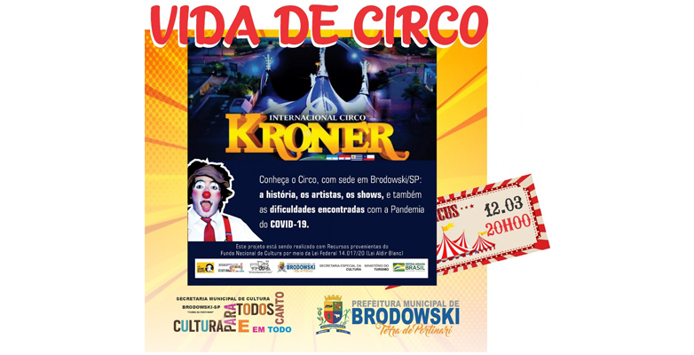 Nesta sexta feira, dia 12 de Março, às 20h00, acontece a estreia do documentário: “Vida de Circo”, contando um pouco da história do “Circo Kronner” de propriedade da Brodowskiana Geovana Karin Franzoni e de seu marido Alexandre Robatini Klein. Desde sua fundação, em Junho de 1990, lugares onde passou, da substituição de animais por talentos humanos, e principalmente das dificuldades enfrentadas por conta da pandemia.