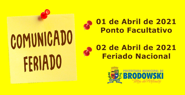 A Prefeitura do Município de Interesse Turístico de Brodowski informa que nas respectivas datas, ocorrerão ponto facultativo e feriado nas repartições públicas do Município.