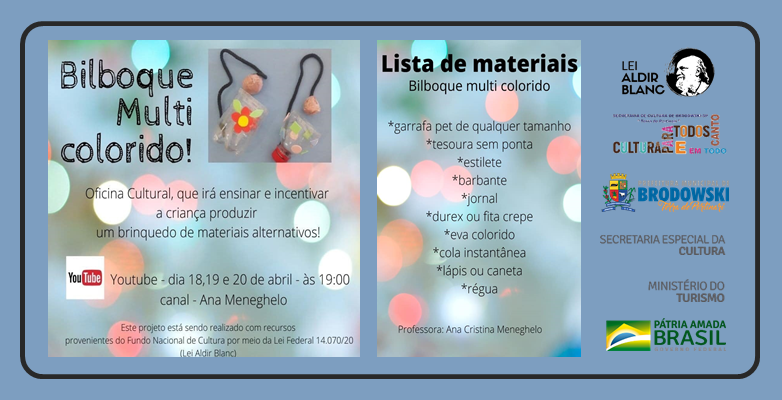 A Secretaria Municipal de Cultura, através da Oficina Cultural Bilboque multi colorido, vem trazer pra vocês, uma opção de brincadeira simples, de baixo custo e muito divertida.