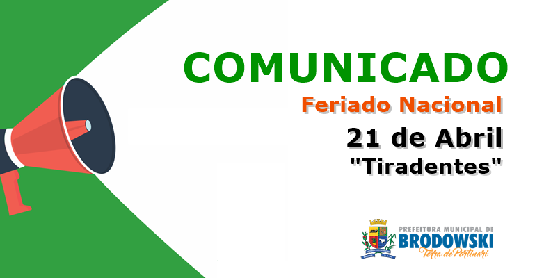 A Prefeitura do Município de Interesse Turístico de Brodowski informa que na respectiva data acima, em decorrência do Feriado Nacional, não haverá expediente e funcionamento nas repartições públicas do Município.