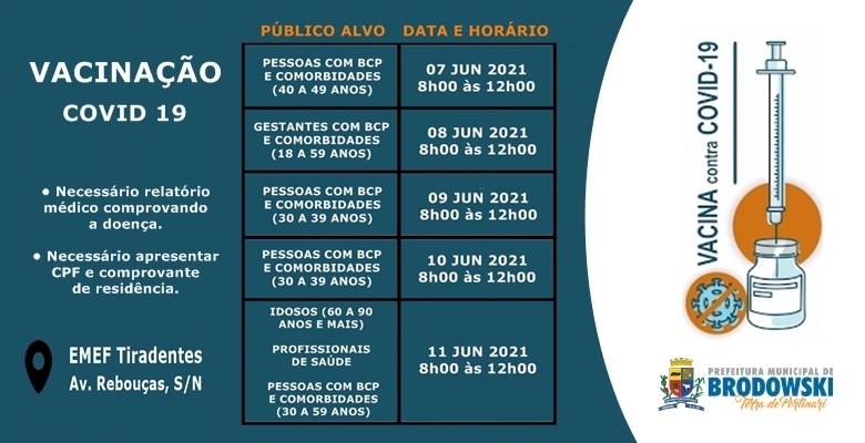 - Local: A vacinação contra a COVID 19 estará acontecendo EXCLUSIVAMENTE na EMEF Tiradentes, Av. Dr. Rebouças, S/N.
