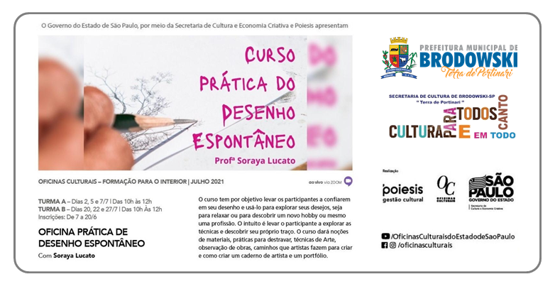 A Prefeitura do Município de Interesse Turístico de Brodowski, através da Secretaria Municipal de Cultura, em parceria com Poiesis, Oficinas Culturais e Governo do Estado de São Paulo através da Secretaria de Cultura e Economia Criativa apresentam: