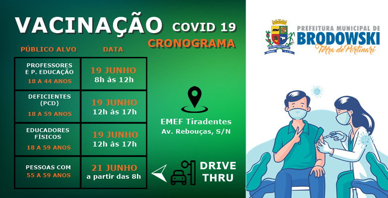 A vacinação contra a COVID 19 estará acontecendo EXCLUSIVAMENTE na EMEF Tiradentes, Av. Dr. Rebouças, S/N.