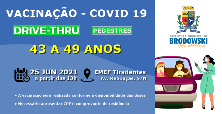 A vacinação contra a COVID 19 estará acontecendo EXCLUSIVAMENTE na EMEF Tiradentes, Rua Floriano Peixoto (Pedestres) e Av. Dr. Rebouças (Drive Thru).