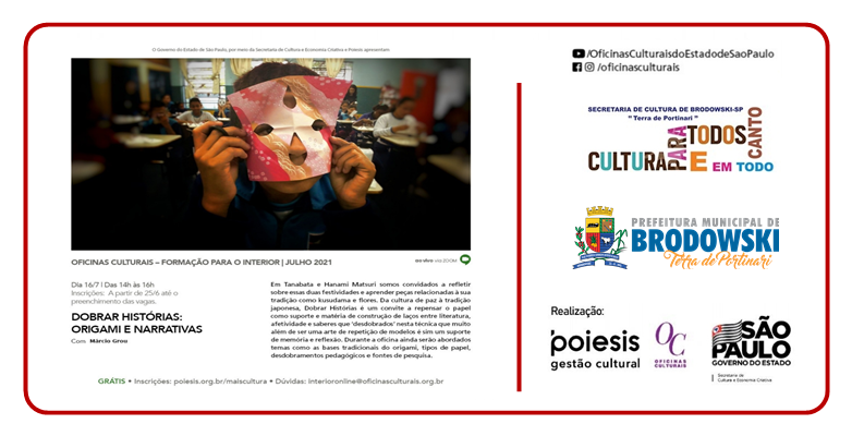 A Prefeitura do Município de Interesse Turístico de Brodowski, através da Secretaria Municipal de Cultura, em parceria com Poiesis, Oficinas Culturais e Governo do Estado de São Paulo através da Secretaria de Cultura e Economia Criativa apresentam: