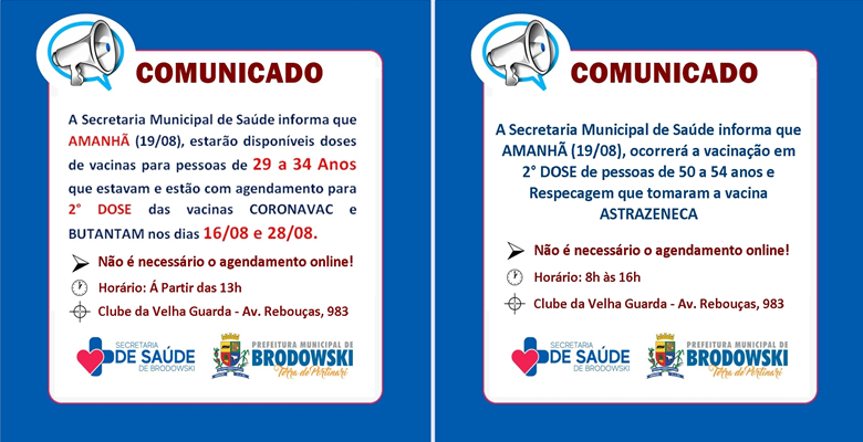 Para pessoas de 50 a 54 Anos e Repescagem, deve-se seguir o agendamento do Cartão de Vacinas, respectivamente para os dias 19 e 20 de Agosto. Pessoas com agendamento para outros datas devem seguir a data do cartão para tomarem a 2° Dose.