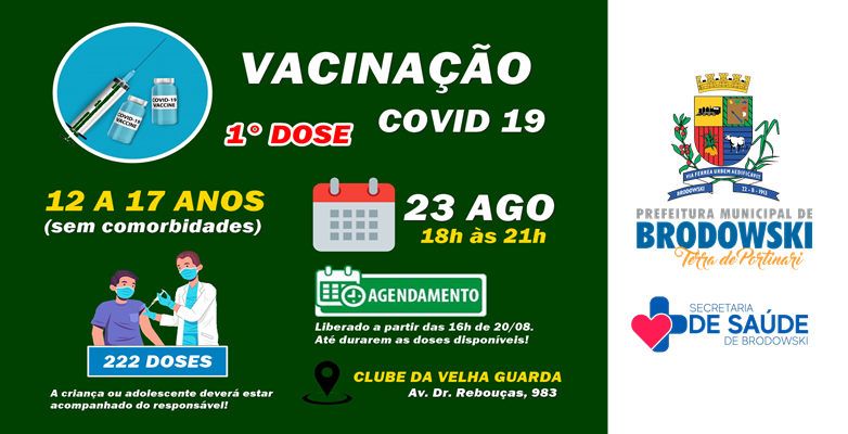- Necessário realizar o AGENDAMENTO ONLINE (Liberado a partir das 16h de 20/08, até durarem as doses disponíveis, sendo 222 Doses).
