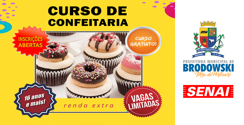 A Prefeitura do Município de Interesse Turístico de Brodowski, através da Secretaria de Trabalho, Emprego e Renda em parceria com o SENAI, abrem 16 Vagas para o Curso de Confeitaria a realizar-se a partir do dia 13 de Setembro de 2021 no Fundo Social de Solidariedade. O curso será totalmente GRATUITO e as vagas limitadas para pessoas de 16 Anos e Mais.