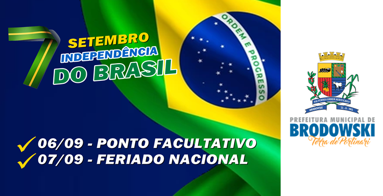 A Prefeitura do Município de Interesse Turístico de Brodowski informa que nas respectivas datas acima, ocorrerão ponto facultativo e feriado nas repartições públicas do Município. Serviços essenciais como coleta de lixo e Unidade Mista Hospitalar funcionarão normalmente neste período.