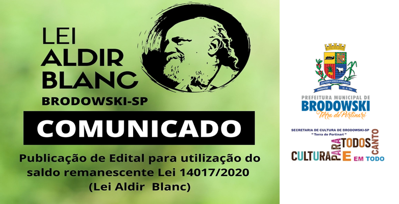 A Prefeitura Municipal de Brodowski através da Secretaria Municipal de Cultura torna público o Edital de convocação de trabalhadores de arte e cultura para utilização de saldo remanescente da Lei 14017/2020 (Aldir Blanc) conforme Decreto Federal nº 10.751, de 22 de Julho de 2021 e Decreto Municipal nº 4.332 de 01 de Setembro de 2021.
