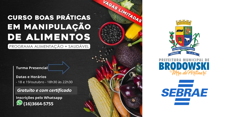O SEBRAE e a Prefeitura do Município de Interesse Turístico de Brodowski, através da Divisão de Vigilância Sanitária oferecem um treinamento focado em Segurança Alimentar para os profissionais que trabalham com alimentos: cozinheiros, saladeiras, auxiliares de cozinha, pizzaiolos, sushimans, chapeiros e todos os profissionais da alimentação que em algum momento estão manipulando os alimentos.