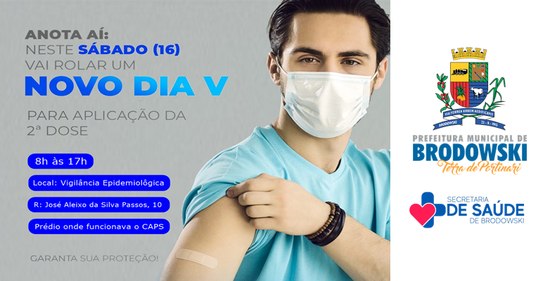 Neste sábado (16/10/2021) acontece “Dia V” de vacinação, mobilização é dedicada à aplicação de segunda dose da vacina contra a COVID 19, uma grande oportunidade para as pessoas que ainda não tomaram a segunda dose fazerem isso com calma e com tempo.