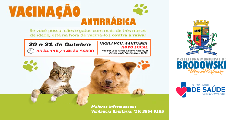 A Vigilância Sanitária e Controle de Vetores de Brodowski informam que realizarão nos dias 20 e 21 de Outubro mais uma etapa da vacinação antirrábica de cães e gatos a partir de 3 meses de idade.