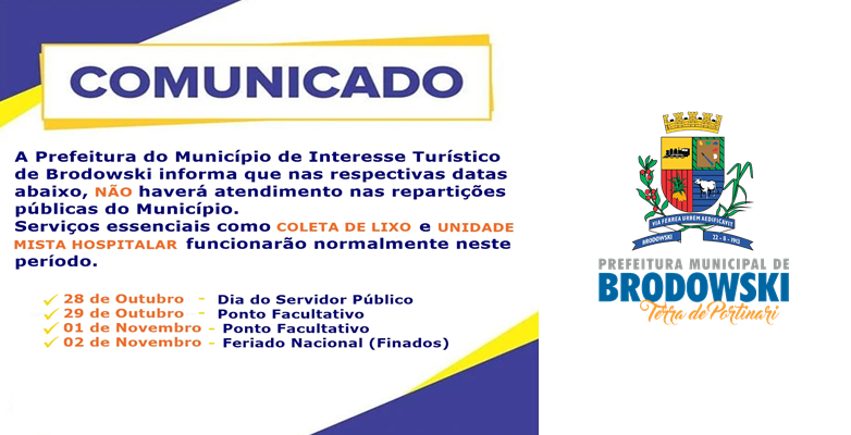 A Prefeitura do Município de Interesse Turístico de Brodowski informa que nas respectivas datas abaixo, NÃO haverá atendimento nas repartições públicas do Município. Serviços essenciais como coleta de lixo e Unidade Mista Hospitalar funcionarão normalmente neste período