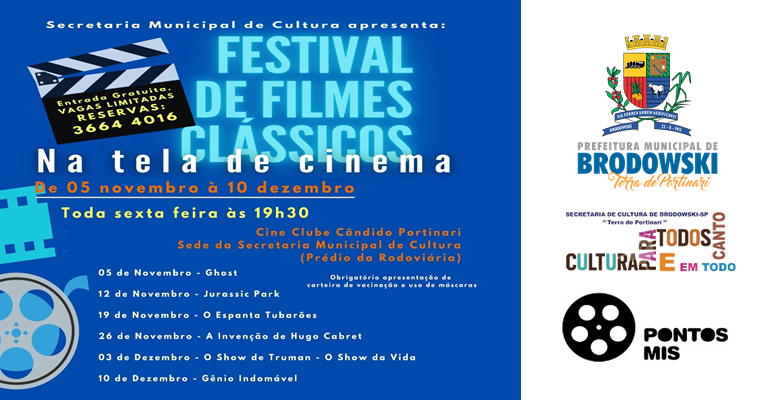 A Prefeitura do Município de Interesse Turístico de Brodowski, através da Secretaria Municipal de Cultura e Pontos MIS apresentam: “Festival de Filmes Clássicos” exibidos na tela de cinema.
