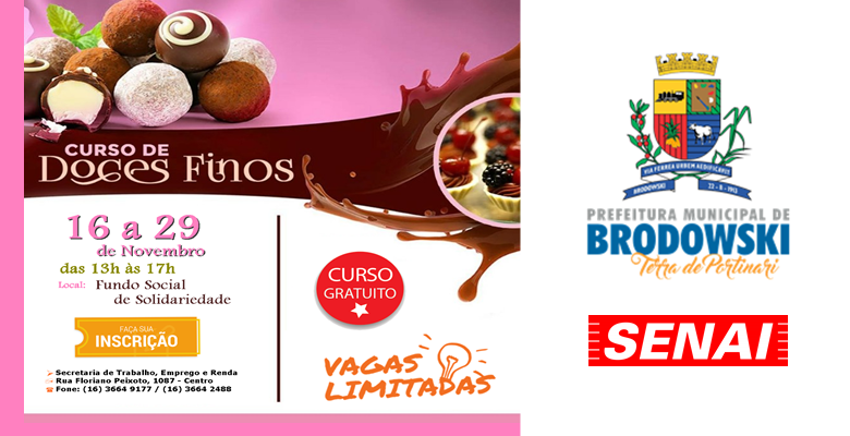 A Prefeitura do Município de Interesse Turístico de Brodowski, através da Secretaria de Trabalho, Emprego e Renda em parceria com o SENAI, abrem Vagas para o Curso de Bombons Finos a realizar-se no Fundo Social de Solidariedade. O curso será totalmente GRATUITO e as vagas limitadas com carga horária de 40h.
