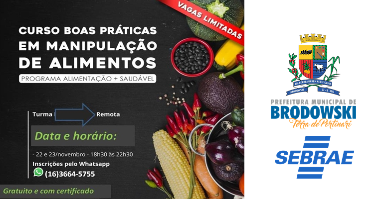 O SEBRAE e a Prefeitura do Município de Interesse Turístico de Brodowski, através da Divisão de Vigilância Sanitária oferecem pela segunda vez, um treinamento focado em Segurança Alimentar para os profissionais que trabalham com alimentos: cozinheiros, saladeiras, auxiliares de cozinha, pizzaiolos, sushimans, chapeiros e todos os profissionais da alimentação que em algum momento estão manipulando os alimentos.