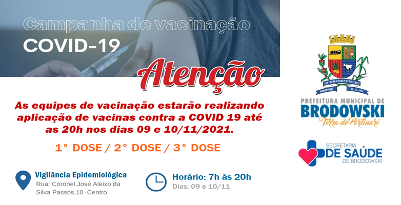 As equipes de vacinação estarão realizando aplicação de vacinas contra a COVID 19 até as 20h nos dias 09 e 10/11/2021. (1° DOSE / 2° DOSE / 3° DOSE).