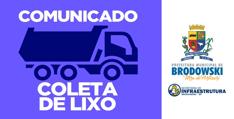 A Prefeitura do Município de Interesse Turístico de Brodowski, através da Secretaria Municipal de Infraestrutura, comunica que devido ao Feriado Nacional de 15 de novembro, a coleta de lixo na próxima semana ocorrerá na TERÇA FEIRA (16/11) e SEXTA FEIRA (19/11).