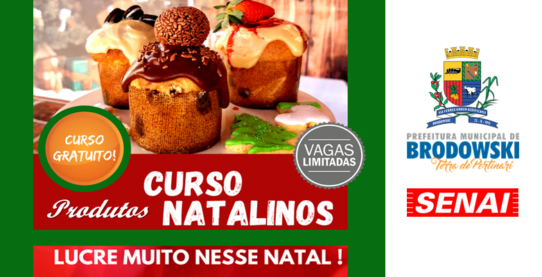 A Prefeitura do Município de Interesse Turístico de Brodowski, através da Secretaria de Trabalho, Emprego e Renda em parceria com o SENAI, abrem Vagas para o Curso de Produtos Natalinos a realizar-se no Fundo Social de Solidariedade. O curso será totalmente GRATUITO e as vagas limitadas com carga horária de 20h.
