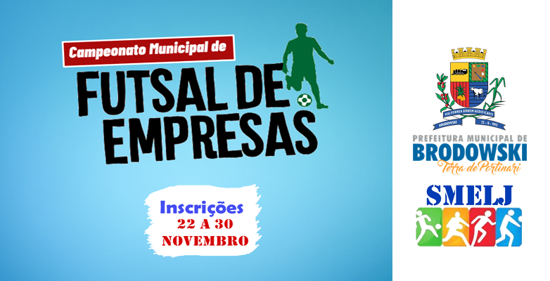 Realizado pela Liga Brodowskiana de Futsal com apoio da Prefeitura do Município de Interesse Turístico de Brodowski, através da Secretaria de Esportes, Lazer e Juventude, estão abertas as inscrições para o “CAMPEONATO MUNICIPAL – FUTSAL DE EMPRESAS”.
