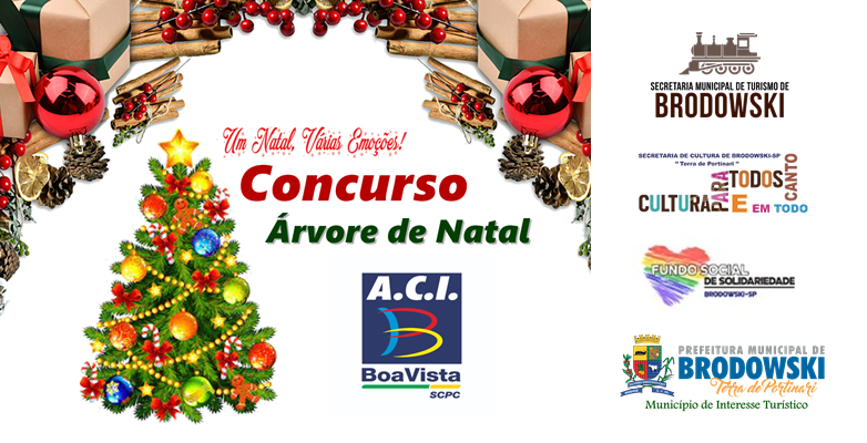 E para deixar nossa cidade mais bonita a ACI Brodowski em parceria com a Prefeitura do Município de Interesse Turístico de Brodowski, Secretaria de Cultura, Secretaria de Turismo e Fundo Social de Solidariedade de Brodowski, estão fazendo um concurso de árvore de natal para as empresas e comércios de nossa cidade, com o tema “UM NATAL, VÁRIAS EMOÇÕES”, visando a CRIATIVIDADE E ORIGINALIDADE.