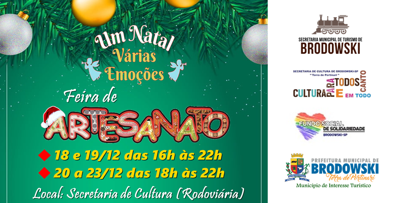 Dentro da Programação do “Natal 2021 – Um Natal, Várias Emoções”, a Prefeitura do Município de Interesse Turístico de Brodowski, através das Secretarias de Cultura e Turismo e Fundo Social de Solidariedade apresentam a Feira de Artesanato com artesãos de Brodowski.