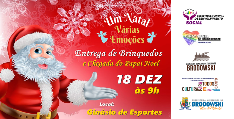 A Prefeitura do Município de Interesse Turístico de Brodowski, através da Secretaria de Desenvolvimento Social em união com o Fundo Social de Solidariedade, Secretaria de Cultura e Secretaria de Turismo apresentam a Entrega de Brinquedos e Chegada do Papai Noel. O evento faz parte dos festejos do “UM NATAL, VÁRIAS EMOÇÕES! – 2021” – Homenageando as emoções vividas durante todo o ano de 2021.