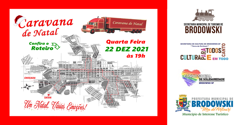 Um lindo passeio realizado por todos os bairros da cidade com caminhões e carros totalmente iluminados e decorados, simbolizado assim a chegada do Natal. A “CARAVANA DE NATAL” fará parte dos festejos do “UM NATAL, VÁRIAS EMOÇÕES! – 2021” – iniciativa da Prefeitura do Município de Interesse Turístico de Brodowski, em união com o Fundo Social de Solidariedade, Secretaria de Cultura e Secretaria de Turismo, afins de celebrar homenageando as emoções vividas durante todo o ano de 2021.