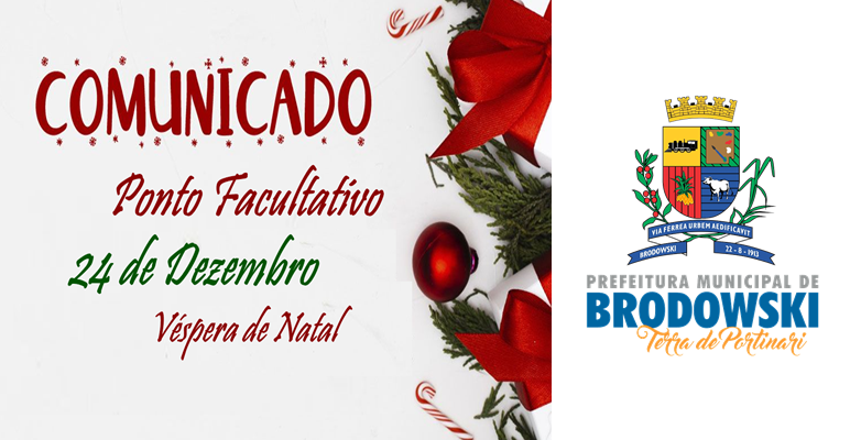A Prefeitura do Município de Interesse Turístico de Brodowski informa que no dia 24 de dezembro de 2021, NÃO haverá expediente nas repartições públicas do Município devido ao PONTO FAVULTATIVO (Véspera de Natal).