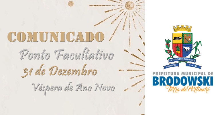 A Prefeitura do Município de Interesse Turístico de Brodowski informa que no dia 31 de dezembro de 2021, NÃO haverá expediente nas repartições públicas do Município devido ao PONTO FACULTATIVO (Véspera de Ano Novo).