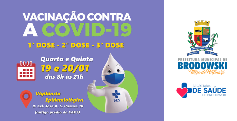 Esta semana, na quarta e quinta feira (19 e 20/01), as esquipes de vacinas estarão com atendimentos das 8h às 21h para pessoas que trabalham durante o dia. Caso você esteja com a sua vacinação atrasada ou já possa tomar a dose de reforço (após 04 meses da 2° dose), procure a Vigilância Epidemiológica na Rua Cel. José Aleixo da Silva Passos, 10 (antigo prédio do CAPS) e regularize sua vacina.