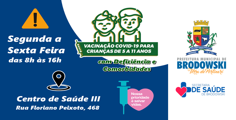 A Secretaria Municipal de Saúde, comunica que ainda está disponível a vacinação contra a COVID 19 para Crianças de 05 anos Completos a 11 anos, 11 meses e 29 dias com deficiência e comorbidades.