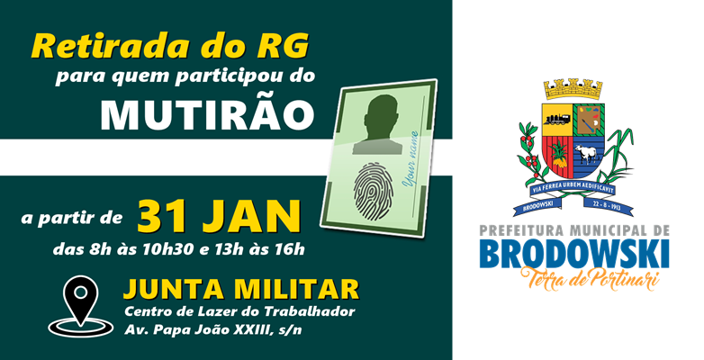 A Prefeitura do Município de Interesse de Brodowski, através da Secretaria de Administração comunica que as pessoas que participaram do MUTIRÃO para emissão de carteira de identidade em dezembro de 2021, poderão retirar o documento a partir da próxima segunda na JUNTA MILITAR de Brodowski, localizada no Centro de Lazer do Trabalhador (Ginásio de Esportes) – Av. Papa João XXIII, s/n.