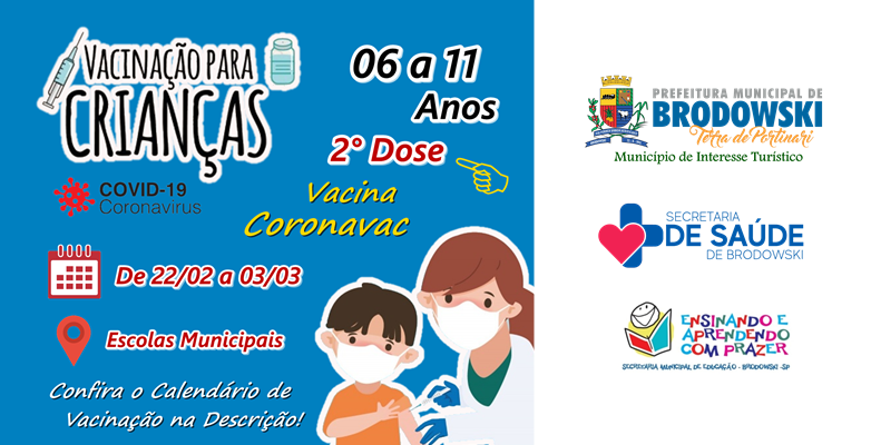 A Secretaria de Municipal de Saúde em parceria com a Secretaria de Municipal de Educação realizará nas Escolas Municipais a 2º DOSE de crianças de 06 a 11 anos que receberam o imunizante CORONAVAC.