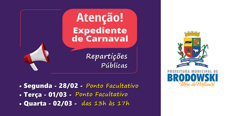 A Prefeitura do Município de Interesse Turístico de Brodowski informa que nos dia 28/02 (Segunda) e 01/03 (Terça), NÃO haverá expediente nas repartições públicas do Município devido aos Pontos Facultativos referentes ao CARNAVAL. No dia 02/03 (Quarta) o expediente terá início após as 13h.