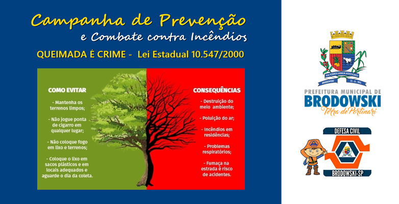 A Prefeitura do Município de Interesse Turístico de Brodowski em união com a DEFESA CIVIL do Município, anunciam durante esse mês de março de 2022, a CAMPANHA DE PREVENÇÃO E COMBATE CONTRA INCÊNDIOS na cidade.