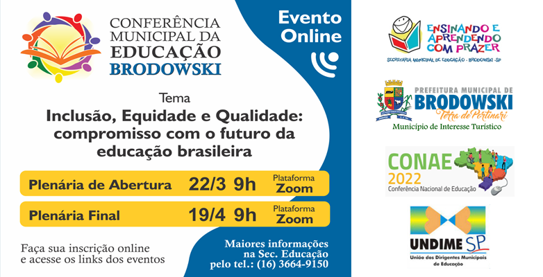A Prefeitura do Município de Interesse Turístico de Brodowski, através da Secretaria Municipal de Educação, convidam a toda população brodowskiana a participar da “CONFERÊNCIA MUNICIPAL DA EDUCAÇÃO”.
