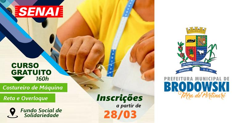 A Prefeitura do Município de Interesse Turístico de Brodowski, através da Secretaria de Trabalho, Emprego e Renda em parceria com o SENAI, abrem Vagas para o Curso de Curso de Costura para Máquina Reta e Overloque, a realizar-se no Fundo Social de Solidariedade. O curso será totalmente GRATUITO e as vagas LIMITADAS.
