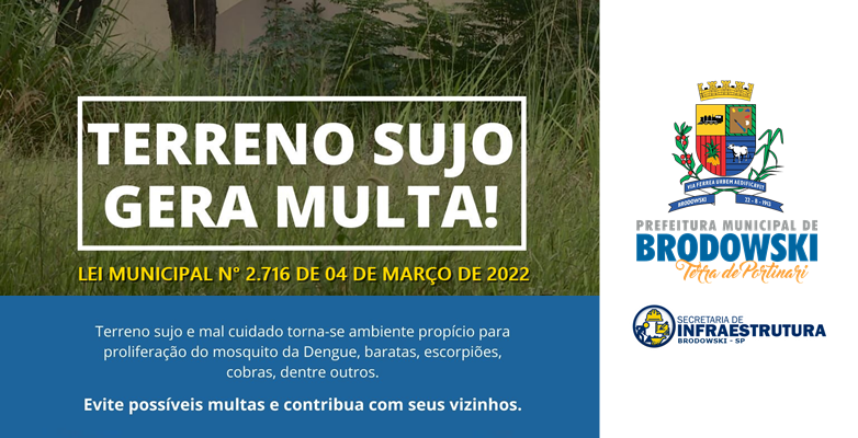 Seguindo as determinações da LEI MUNICIPAL N° 2.716 DE 04 DE MARÇO DE 2022, todo proprietário de terreno tem a obrigação de manter a limpeza de seu terreno, estando prevista multa em caso de descumprimento após notificação recebida no prazo de 15 dias com aviso e publicação em site oficial e veículos de comunicação da Prefeitura de Brodowski.