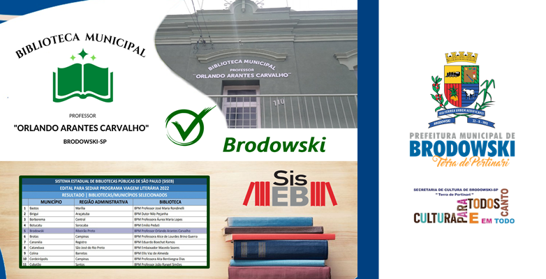 A Prefeitura do Município de Interesse Turístico de Brodowski, através da Secretaria Municipal de Cultura, mantenedora da Biblioteca Pública Municipal “Prof. Orlando Arantes Carvalho”, tem o prazer de anunciar que depois de muitas demandas exigidas, Brodowski ficou entre as 62 cidades selecionadas para Sediar a 14ª EDIÇÃO DO PROGRAMA VIAGEM LITERÁRIA DO SISTEMA ESTADUAL DE BIBLIOTECAS PÚBLICAS DE SÃO PAULO (SISEB).