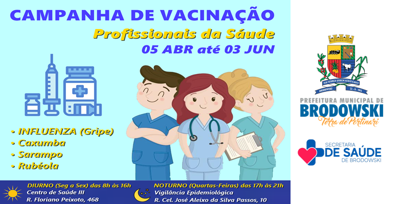 A partir do dia 05/04 até o dia 03/06 de 2022, ocorrerá a CAMPANHA DE VACINAÇÃO contra Influenza (Gripe), Caxumba, Sarampo e Rubéola para PROFISSIONAIS DA SAÚDE no município.
