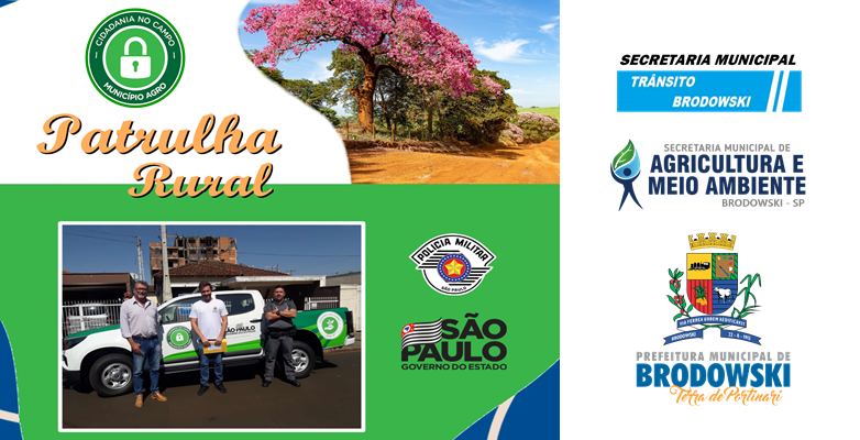 A Prefeitura do Municipio de Interesse Turístico de Brodowski, através da Secretaria de Trânsito e Segurança e Secretaria de Agricultura e Meio Ambiente em parceria com a Polícia Militar colocarão em operação a PATRULHA RURAL em Brodowski.