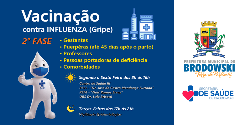 A partir de HOJE 09/05) já está disponível a 2°Fase da Vacinação contra a INFLUENZA (Gripe) no município. A vacinação está acontecendo em período DIURNO e NOTURNO.