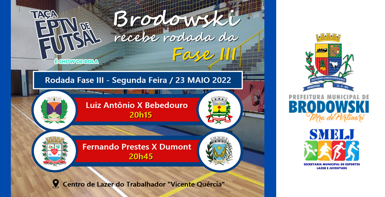 HOJE (23/05) à partir das 20h15 no Centro de Lazer do Trabalhador acontece jogos de duas rodadas da Fase III da Taça EPTV de Futsal. A Fase III, tem 14 times divididos em 7 grupos de duas equipes, classificando-se 7 equipes vencedoras dos confrontos mais uma equipe no índice técnico.
