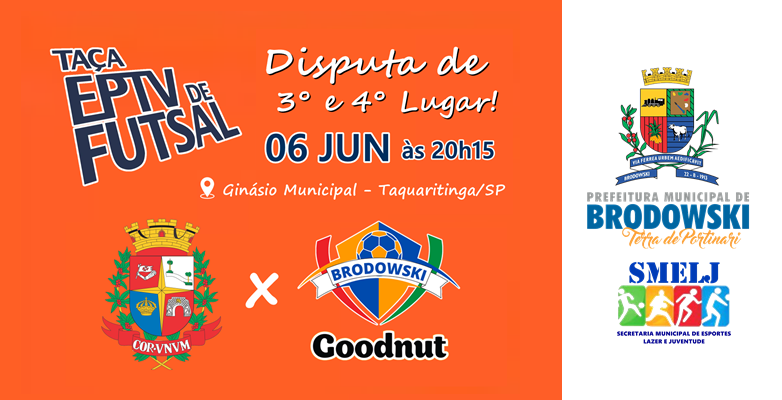 HOJE (06/06) às 20h15 na cidade de Taquaritinga-SP, a equipe de Futsal de Brodowski entrará em quadra contra a equipe da casa para a disputa do 3° ou 4°lugar da Taça EPTV de Futsal. Ocorrendo empate no tempo normal, a disputa será os pênaltis.