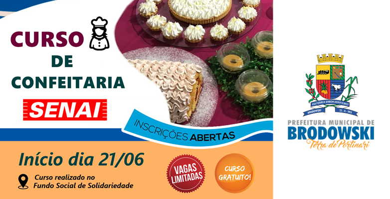 A Prefeitura do Município de Interesse Turístico de Brodowski, através da Secretaria de Trabalho, Emprego e Renda em parceria com o SENAI, abrem 20 Vagas para o Curso de Confeitaria a realizar-se a partir do dia 21 de Junho de 2022 no Fundo Social de Solidariedade. O curso será totalmente GRATUITO e as vagas limitadas para pessoas de 16 anos e mais!