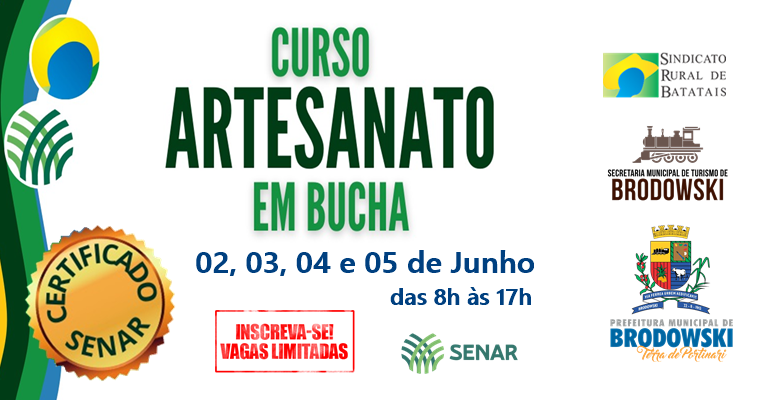 A Prefeitura do Município de Interesse Turístico de Brodowski, através da Secretaria Municipal de Turismo em parceria com o SENAR e o Sindicato Rural de Batatais-SP, trazem a oportunidade do Curso “Artesanato em Bucha”.