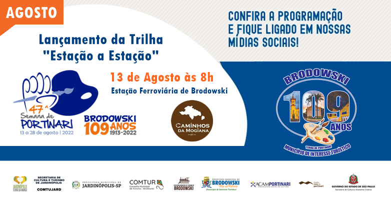 A Secretaria Municipal de Turismo de Brodowski e o Conselho Municipal de Turismo – COMTUR convidam para a Caminhada na Trilha Estação a Estação – Brodowski a Estação Visconde. O percurso do trem entre essas estações é um patrimônio histórico da nossa Região Turística Caminhos da Mogiana e a partir desta data estará disponível para os amantes da caminhada, do ciclismo, para contemplarem o trajeto de trem que existia entre essas estações. Com saída às 8h da Estação Brodowski.